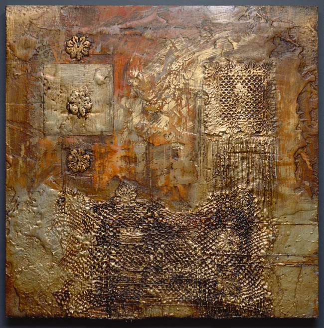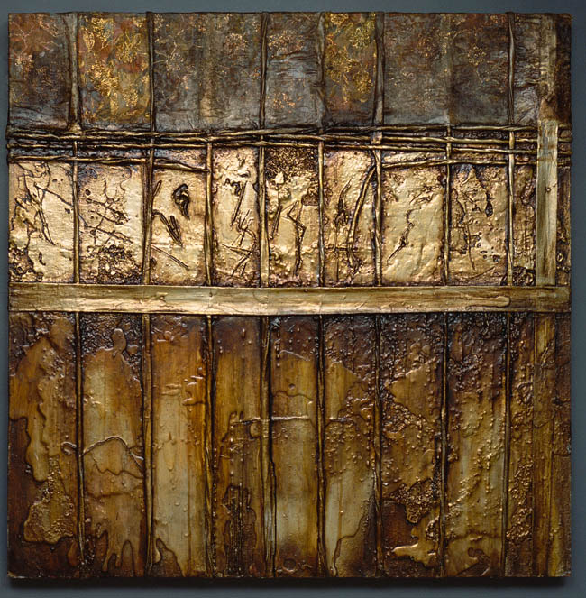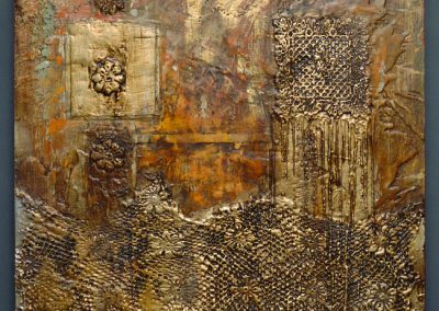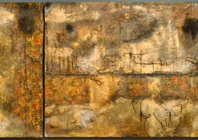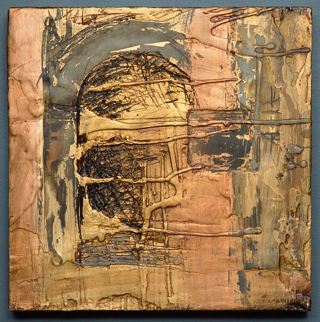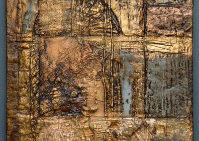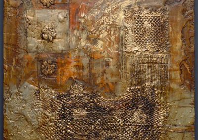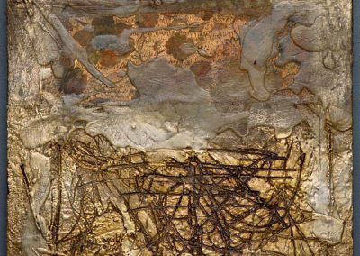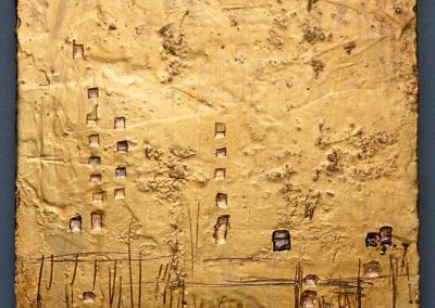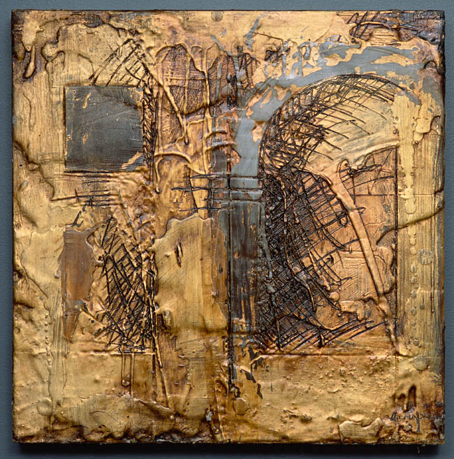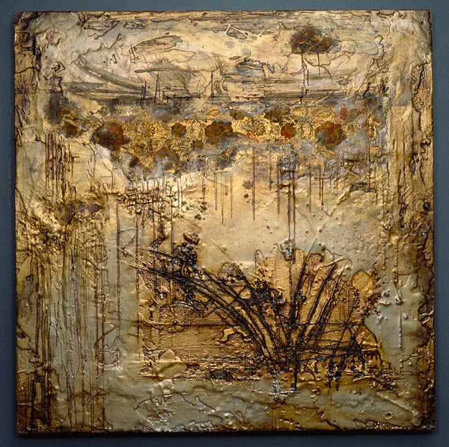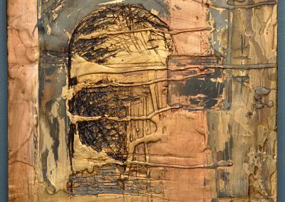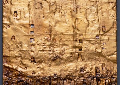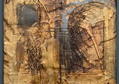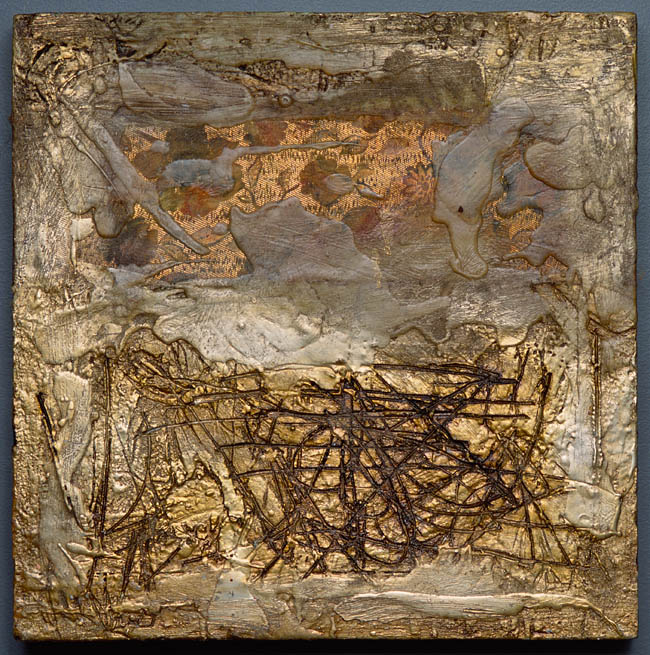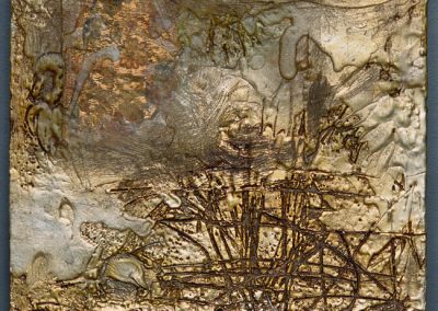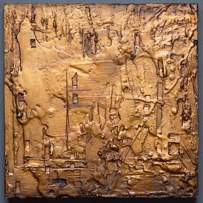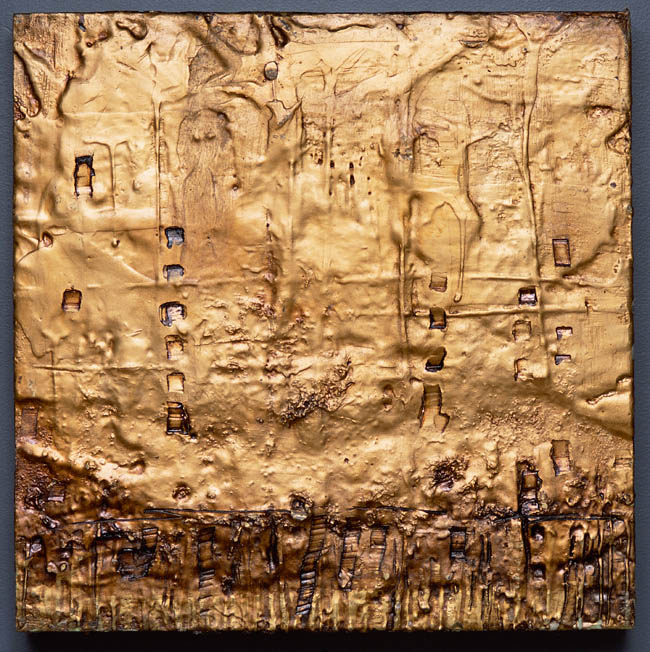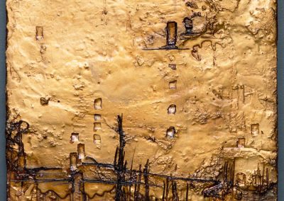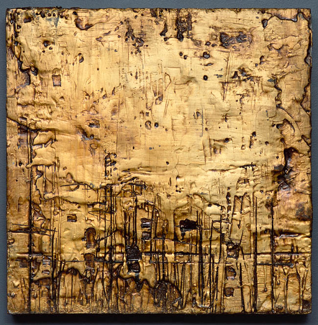 The artist, alchemist applies her materials to build wondrously thick and lusterous surfaces, which are then harshly abraded to reveal the subtle underlying layers. This process requires a great deal of aggressive, often brutal intervention via the burning and scraping of the surface to expose a delicate, sensitive, yet raw reality.
