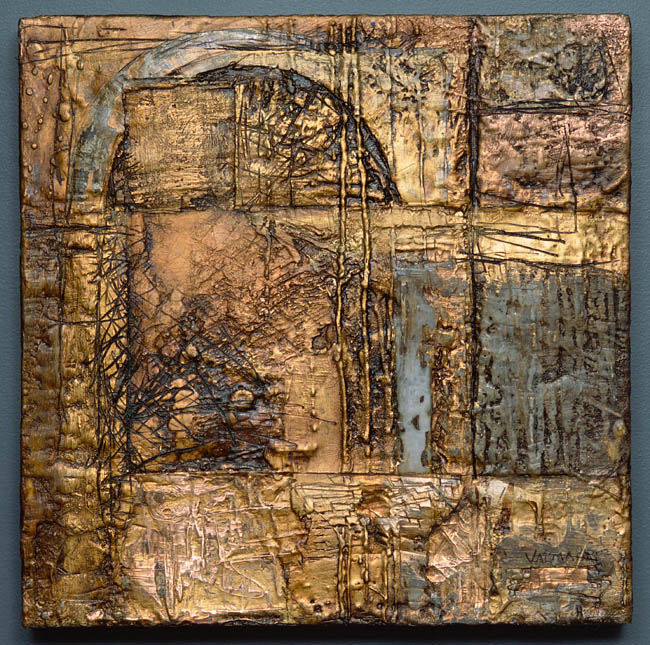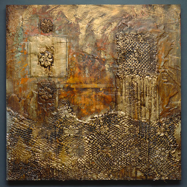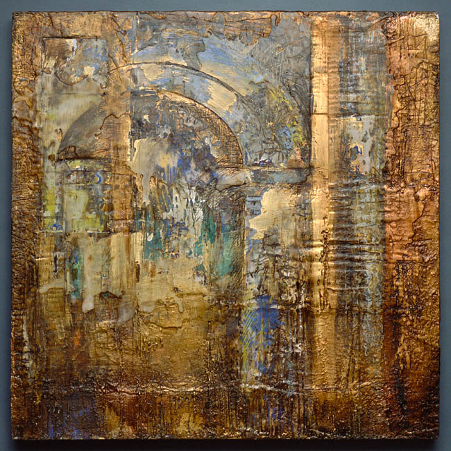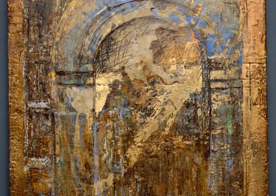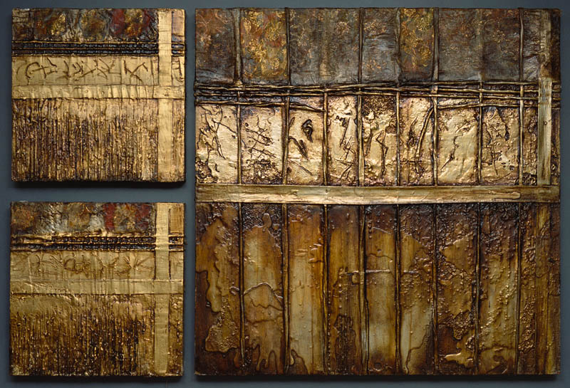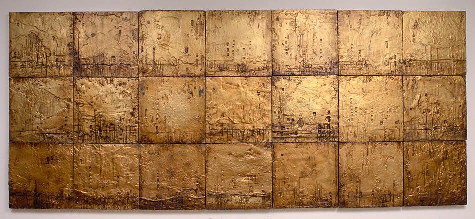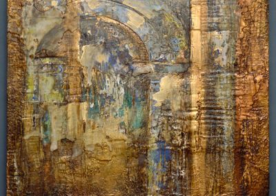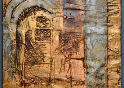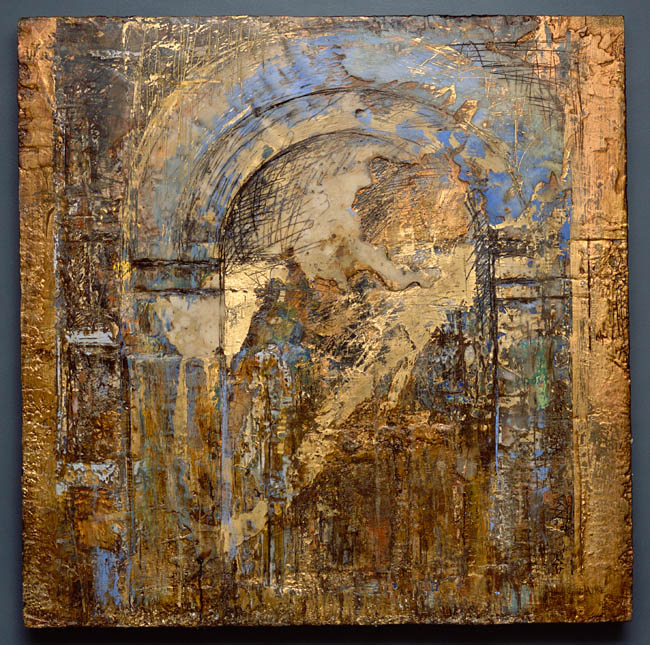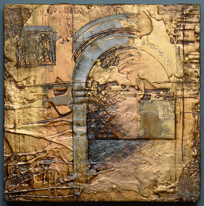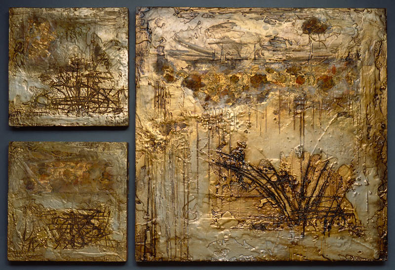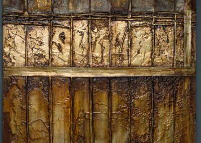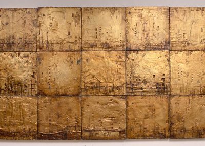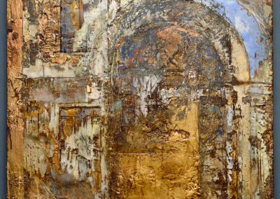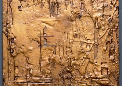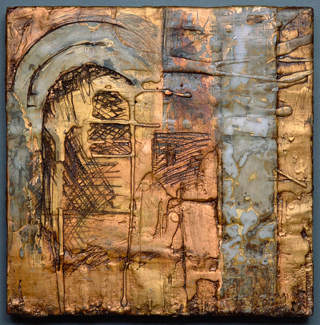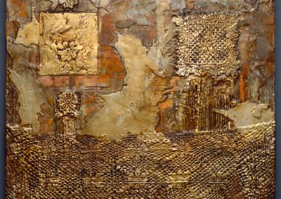 The artist, alchemist applies her materials to build wondrously thick and lusterous surfaces, which are then harshly abraded to reveal the subtle underlying layers. This process requires a great deal of aggressive, often brutal intervention via the burning and scraping of the surface to expose a delicate, sensitive, yet raw reality.