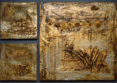 In this recent exhibition, aptly titled “Alchemy”, Jenny Valmadre makes a subtle yet determined shift from the constricting and divergent concerns of a single discipline. With this series of new works she firmly locates herself within the exciting realms of hybridisation. Rather than forgoing her wealth of experience as both a sculptor and ceramicist, Valmadre applies her understanding of three-dimensional materials to the two-dimensional plane. The resulting works are a new narrative. One that speaks of the energy and the materials used by a sculptor, mixed with the pigments and tonal concerns of a painter; finally enriched by the elementary act of drawing.