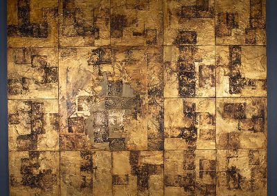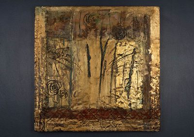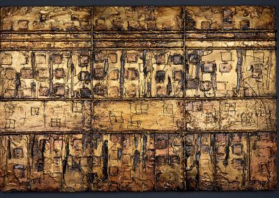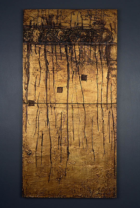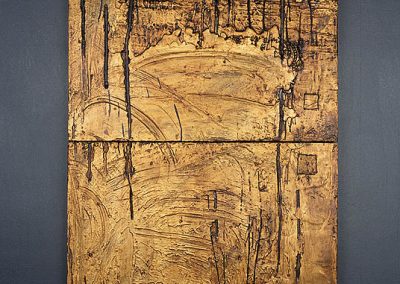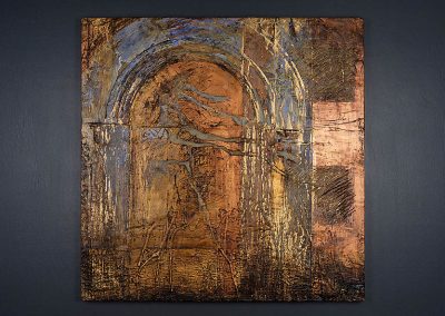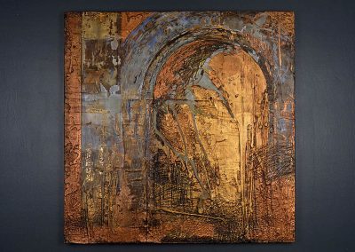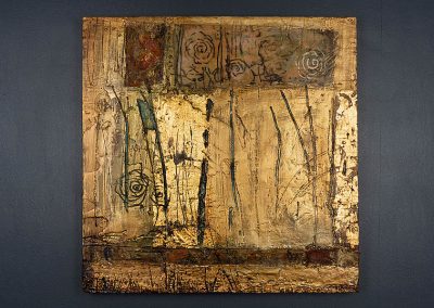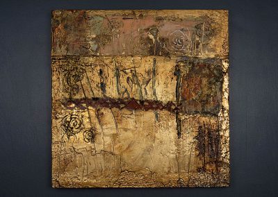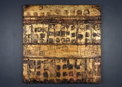 In this series of thirty works, the creative process and experience is about the mastering of variables and the exploitation of materials and their individual qualities. The underlying theme and content of the work is driven by surface production, however, aesthetic control is maintained in a sort of interplay between the serendipitous and the intentional. Works such as The Bastion & Tall Poppies are unified by the choice of materials; mixed media and wax finally connected by the ongoing process of surface destruction and reconstruction.
