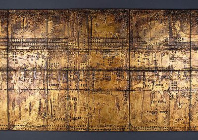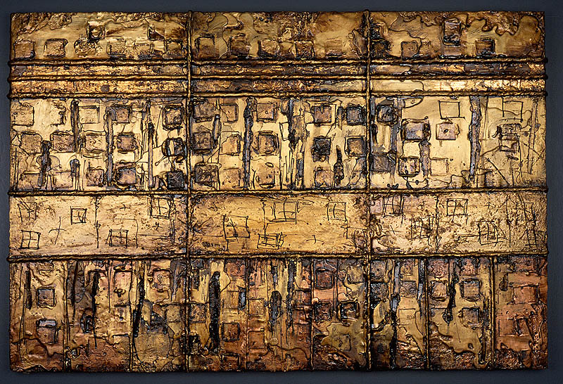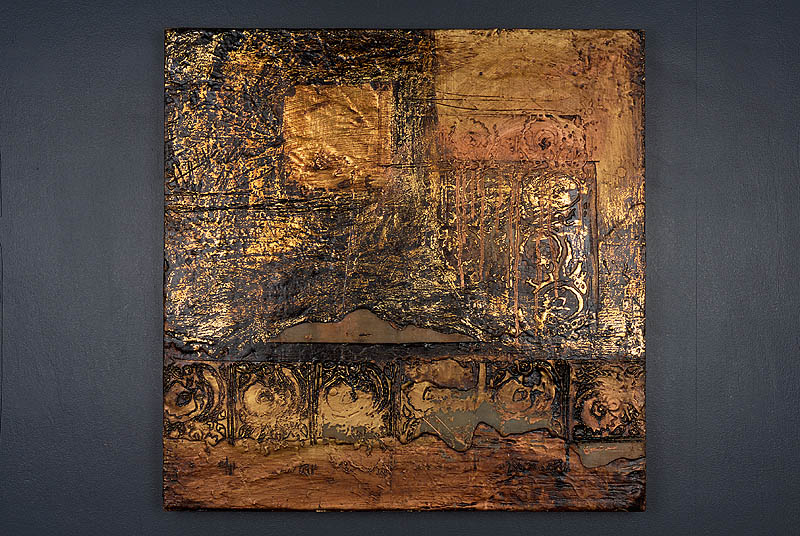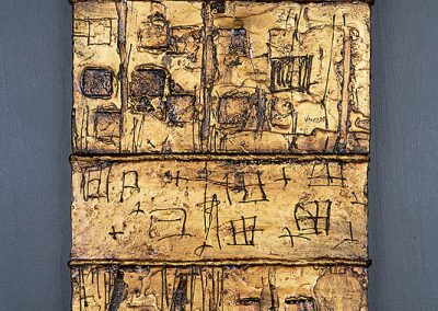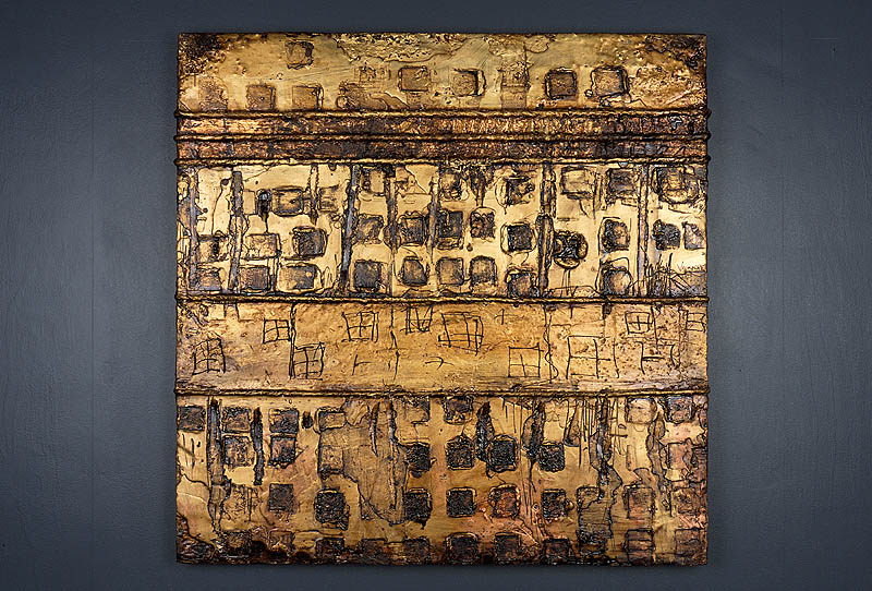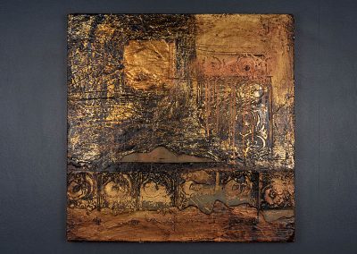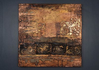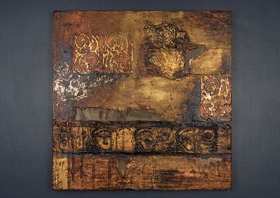 Personally, the physical act of making these artworks is a process of practical discovery. The revealed surface is paramount. Layers are built over layers and then abraded via heating, chiselling, grinding and scraping to reveal what lies below. It is through the unearthing of these layers that the content slowly presents itsel.