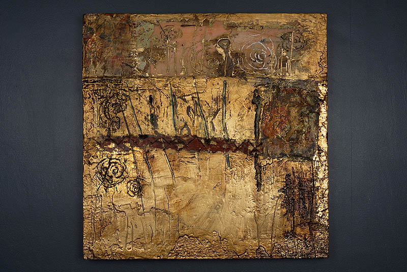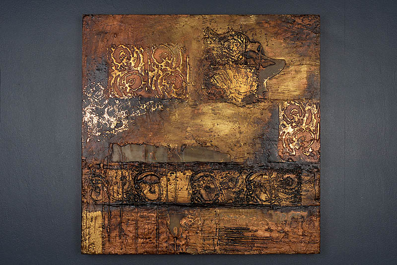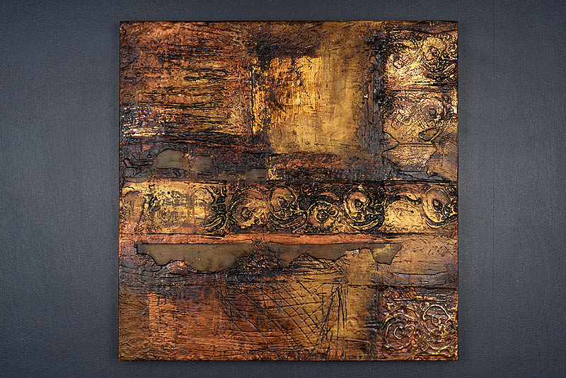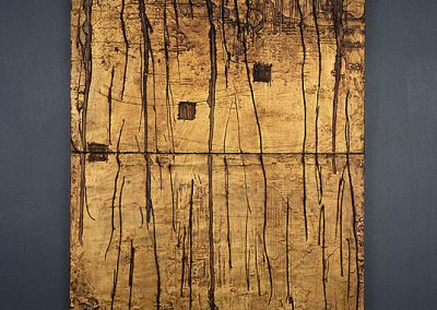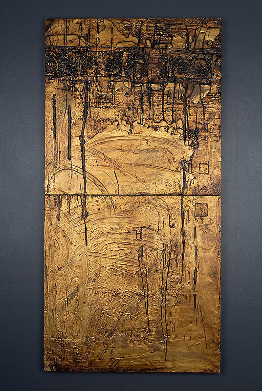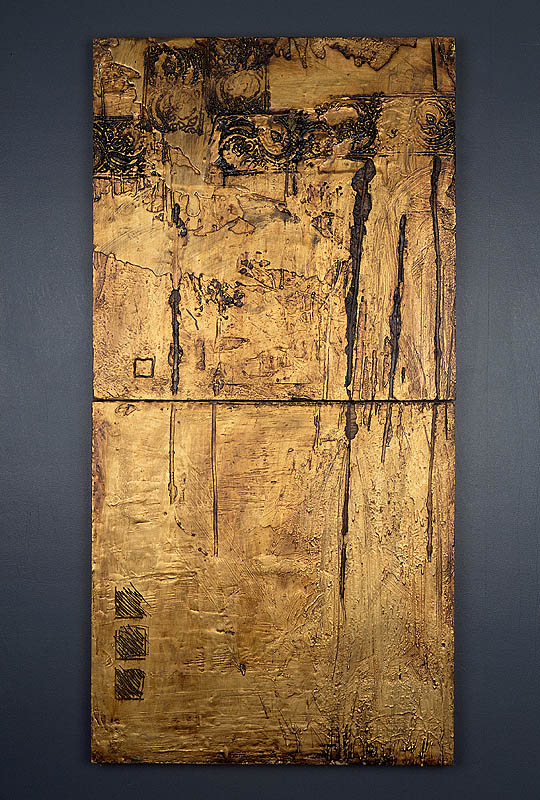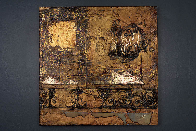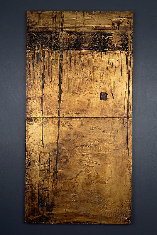 The juxtaposition of subtle and concentrated lines and motifs against a harshly rendered surface is all important as are sub-conscious thoughts against the conscious act of placement and balance.