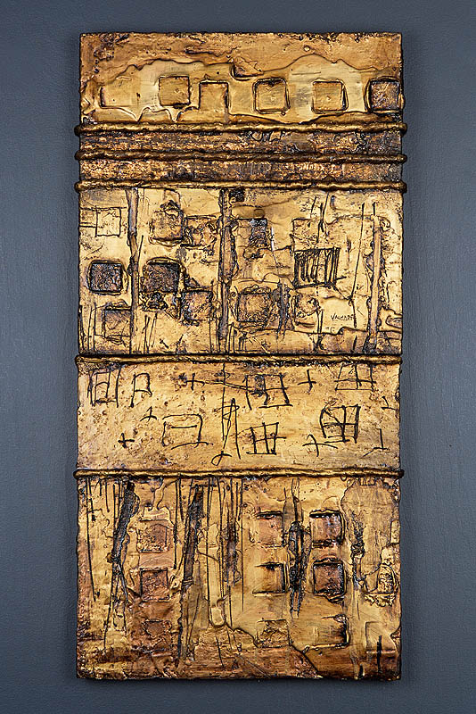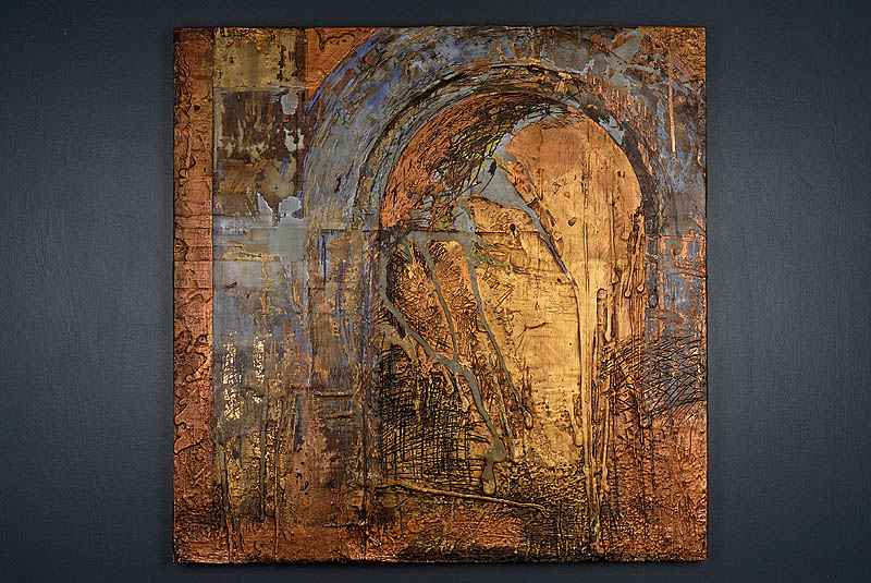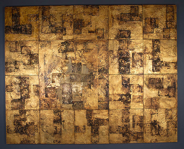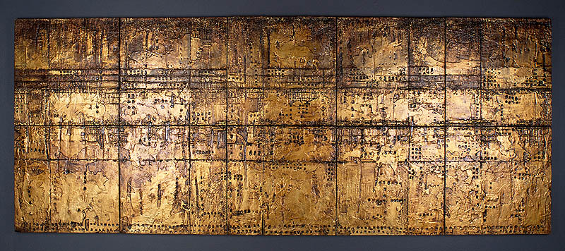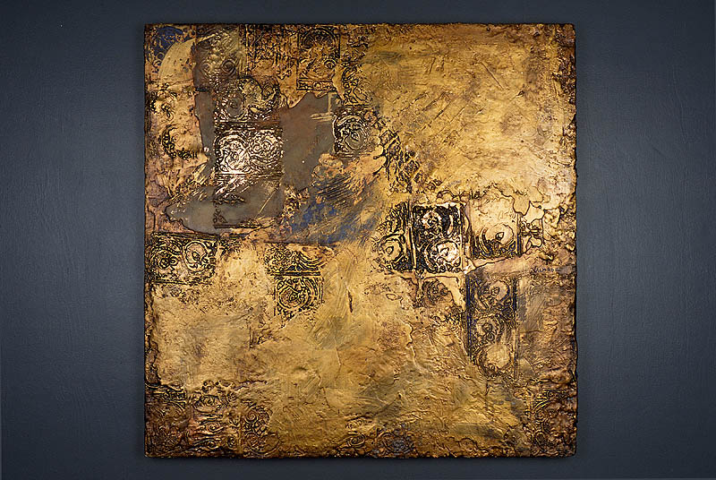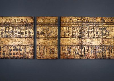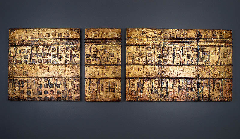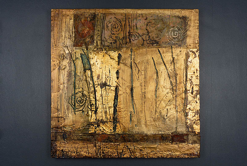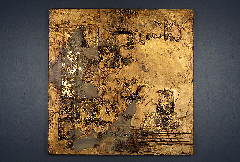 The juxtaposition of subtle and concentrated lines and motifs against a harshly rendered surface is all important as are sub-conscious thoughts against the conscious act of placement and balance.