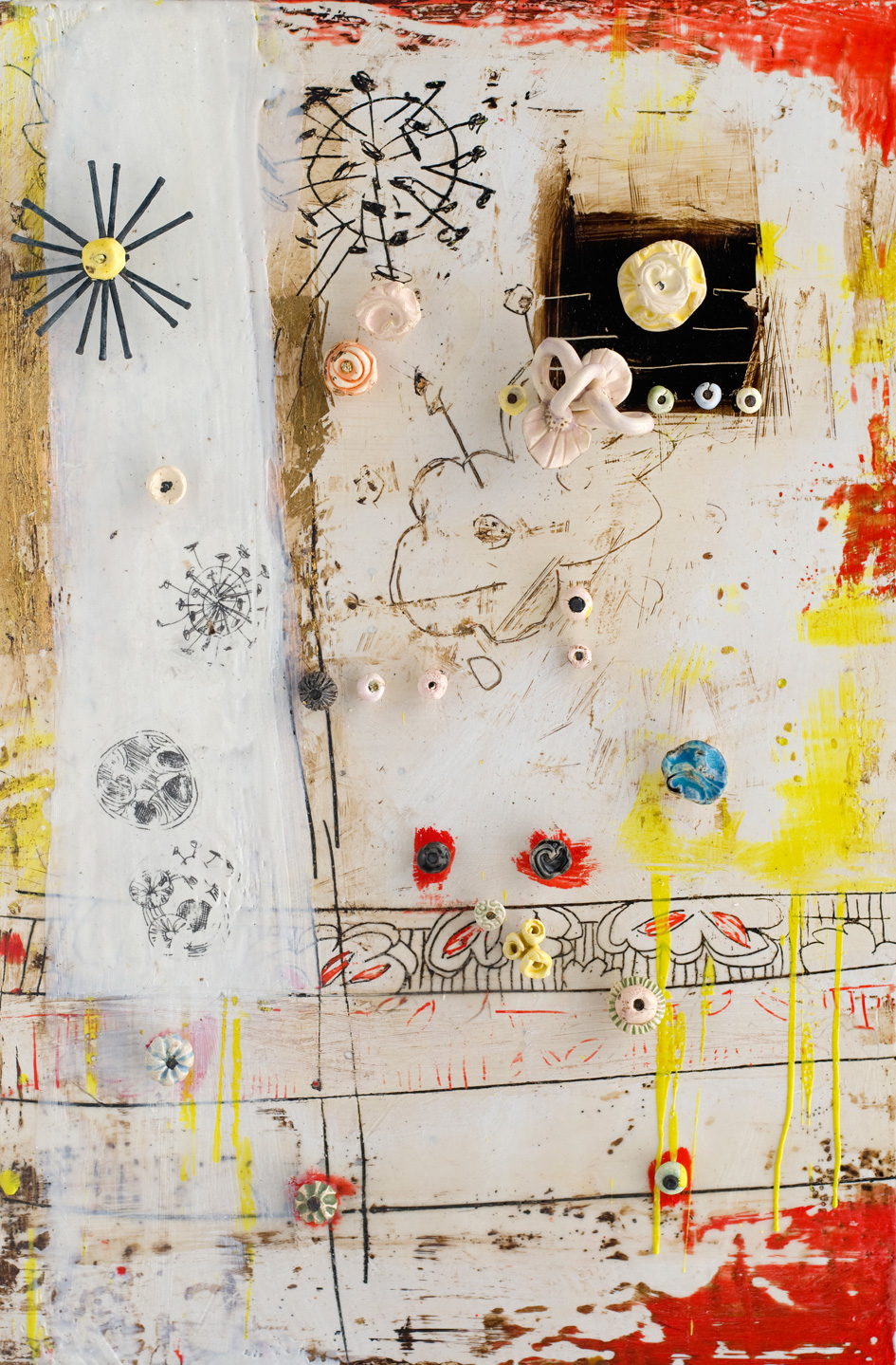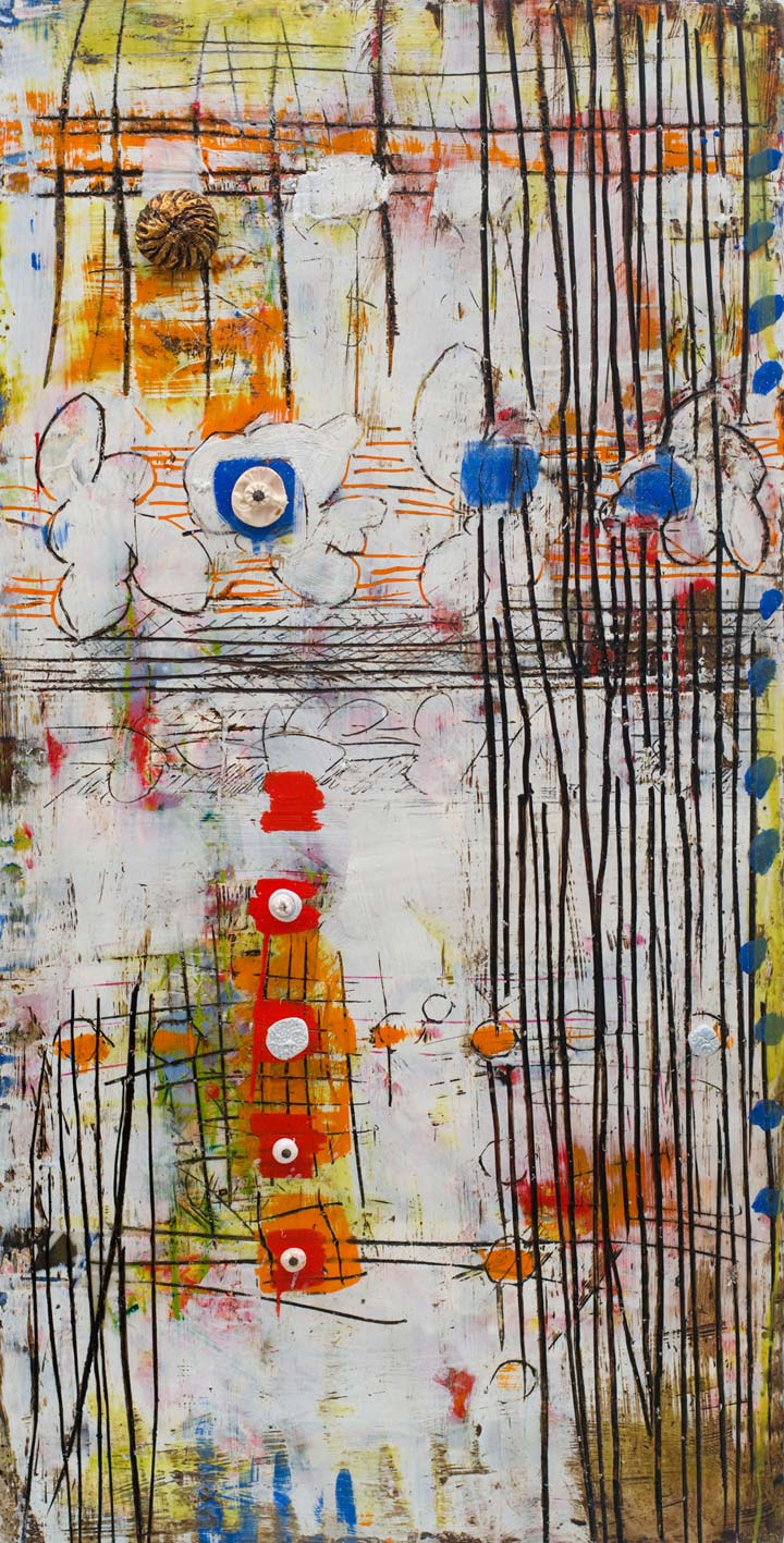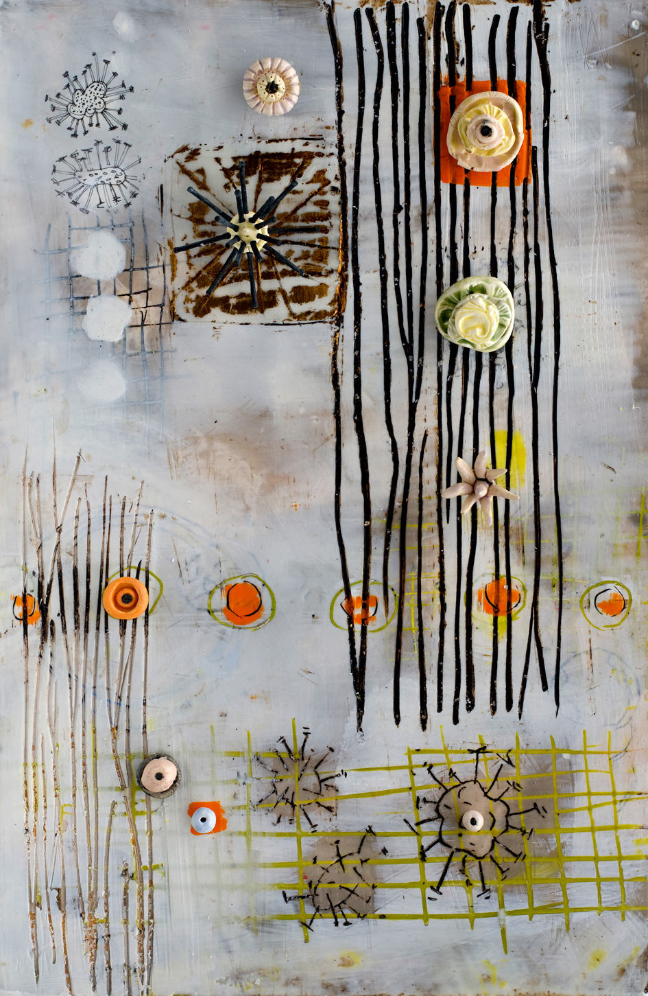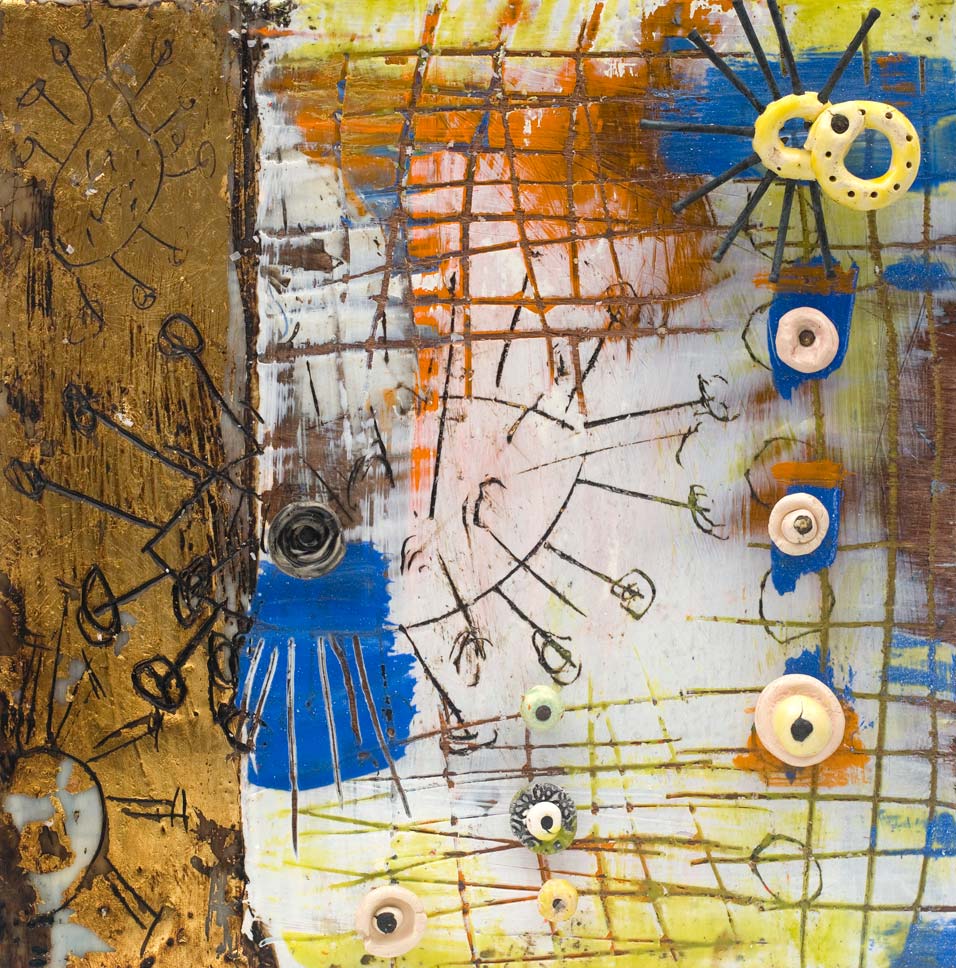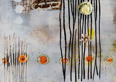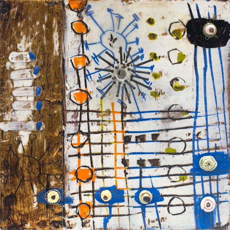 The ceramic bits and pieces represent my neurons and the encaustic drawing my neural pathways; no wonder my synapses get a little confused.