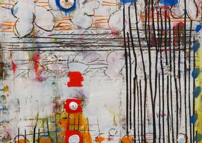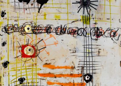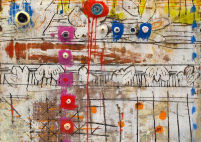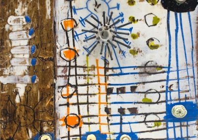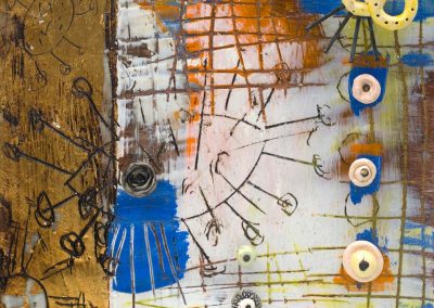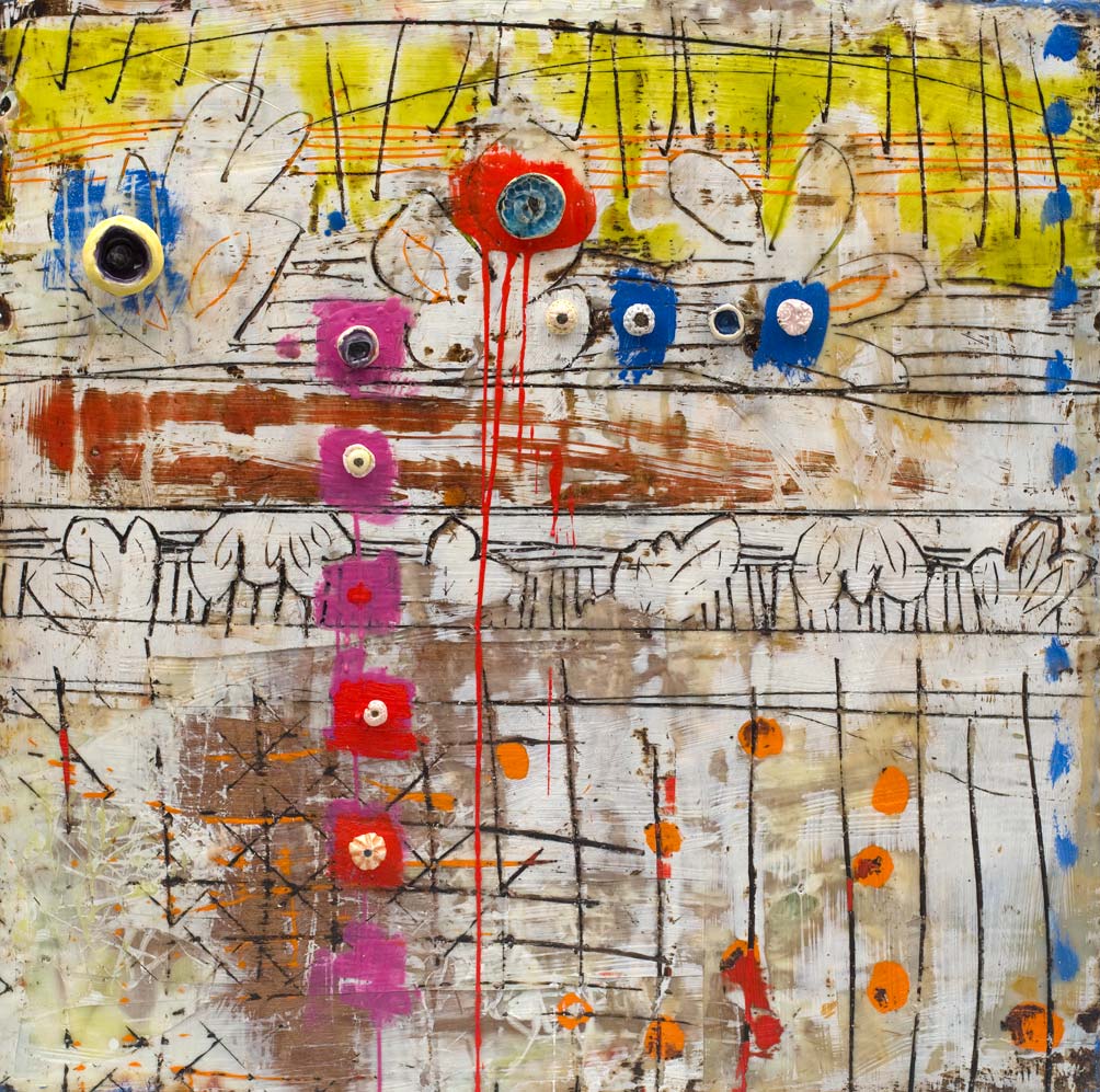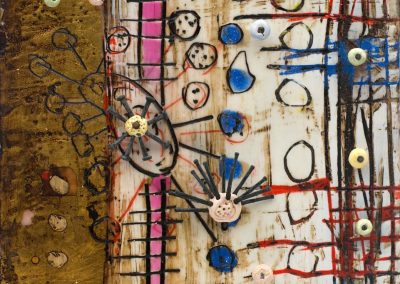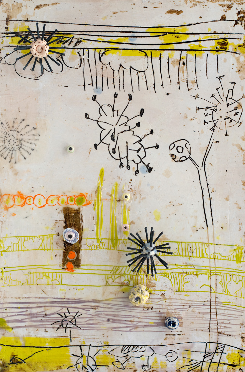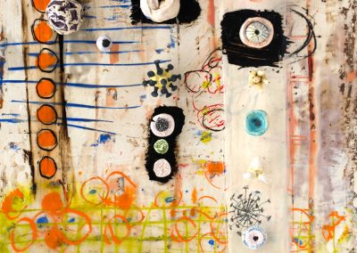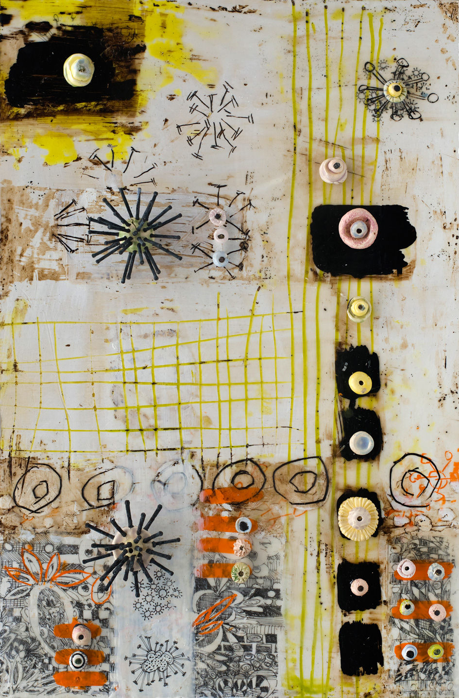 The ceramic bits and pieces represent my neurons and the encaustic drawing my neural pathways; no wonder my synapses get a little confused.
